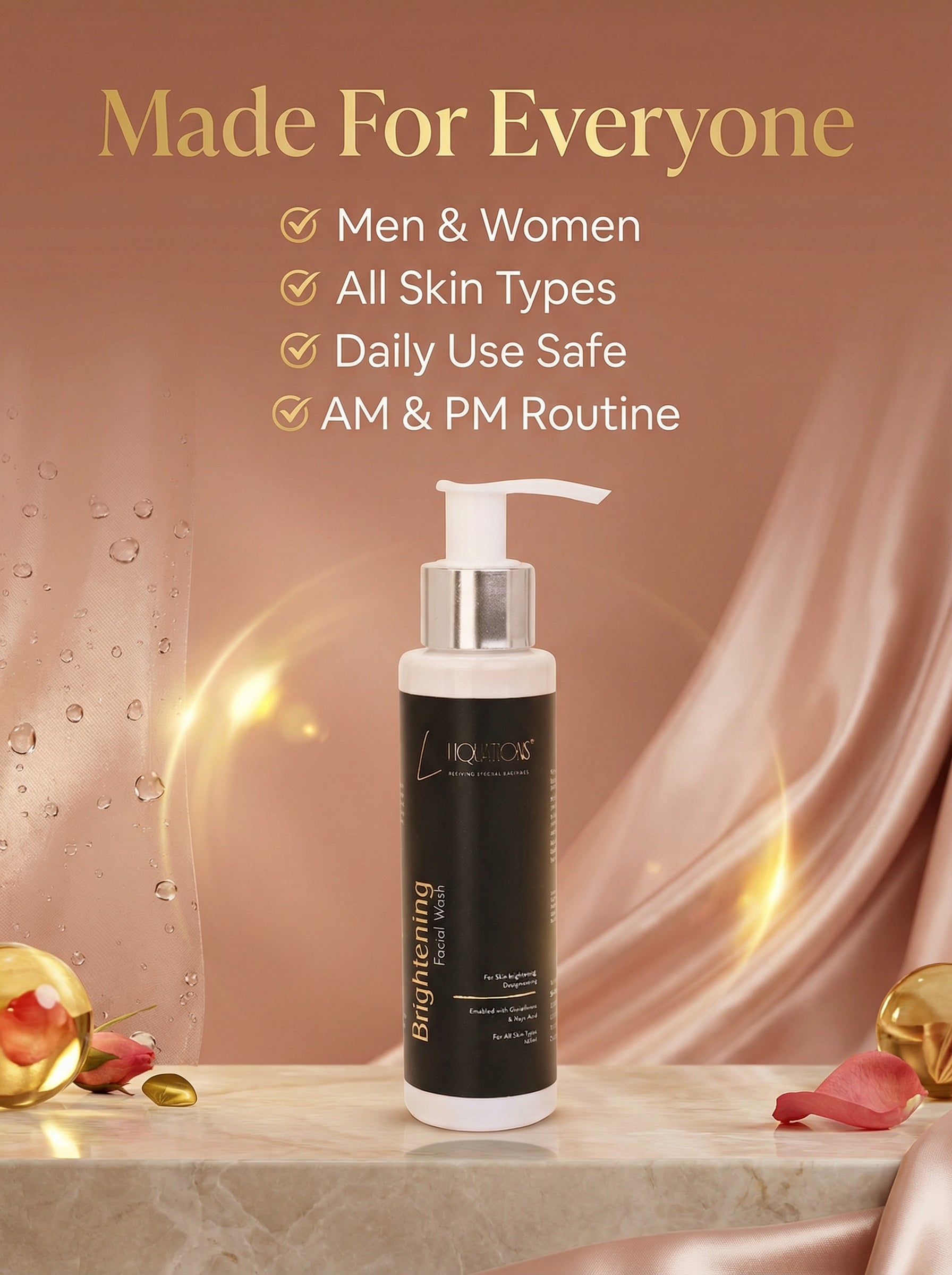 Liquations Brightening Face Wash is a gentle facial cleanser formulated with Kojic Acid and Glutathione to help brighten the skin, reduce hyperpigmentation, and promote an even skin tone.